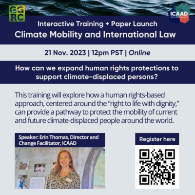 Please join ICAAD and GGRC for an interactive training on climate-induced displacement and international law. All experience and knowledge levels are welcome. The training will feature the launch of ICAAD’s Right to Life with Dignity Policy Paper, which proposes a new framework to expand legal protections for those displaced by the climate crisis.