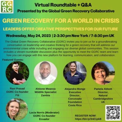 The Global Green Recovery Collaborative (GGRC) invites you to join us for a groundbreaking conversation on leadership and creative thinking for a green recovery that will address our environmental crises while including and engaging our diverse global communities. This session includes a vibrant panel discussion plus the opportunity to meet the GGRC team and learn how you can engage with this new platform for learning, communication, and collaboration.